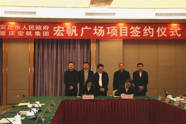 2月26日,宏帆集團與安丘市人民政府舉行宏帆廣場(chǎng)項目簽約儀式。安丘市市委書(shū)記李新閣出席并講話(huà),宏帆集團黨委書(shū)記、總裁王僉與安丘市委副書(shū)記、市長(cháng)杜建華分別代表雙方簽約。安丘市市委常委、辦公室主任郭永超、副市長(cháng)冷文清、宏帆集團副總裁任光榮、總裁助理劉知遷等一同出席簽約儀式。